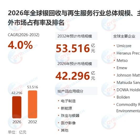 为了解决工业与医疗领域含银废料资源化利用与战略性贵金属供应链安全的双重挑战,银回收与再生服务应运 而生。其核心目标是将银资源重新纳入经济循环,减少对原生矿产的依赖,降低环境负担,同时为客户创造经 济价值。需求主要来源于工业、医疗废弃物资源化与战略性贵金属供应链安全保障的双重驱动。其上游供应链 涵盖含银废料的产生端,包括电子制造、光伏产业、电镀加工、影像医疗、首饰加工等行业的废弃物及副产 品;下游则延伸至精炼银的直接应用产业,如电子元器件制造、新能源、珠宝首饰、投资银条、医疗影像等领 域。该服务作为循环经济的关键节点,通过技术化、规模化处理 "城市矿产",将分散的废弃物转化为标准工 业原料,缓解了原生银矿的资源压力。 根据 QYResearch 最新调研报告" 2026-2032 全球与中国 银回收与再生服务 市场现状及未来发展趋势 "显示, 预计 2 03 2 年全球 银回收与再生服务 市场规模将达到 7.87 亿美元,未来几年年复合增长率 CAGR 为 4% 。 市场发展概况 银回收与再生服务市场正处于快速成长期。其发展核心由全球绿色循环经济转型、关键矿产资源安全保障战 略,以及下游高新技术产业的强劲需求( ...