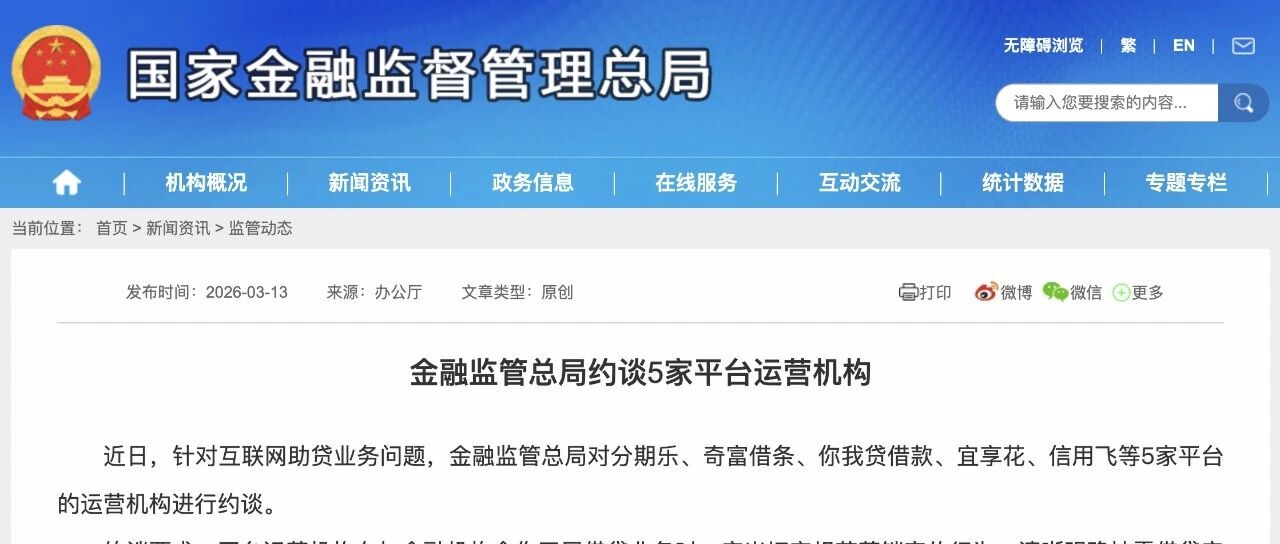 金融监管总局约谈分期乐、奇富借条、你我贷借款、宜享花、信用飞等5家平台运营机构