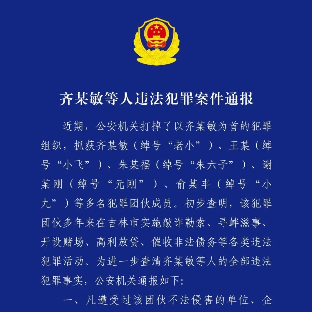吉林警方:抓获齐某敏(绰号“老小”)、王某(绰号“小飞”)、朱某福(绰号“朱六子”)、俞某丰(绰号“小九”)等犯罪团伙成员