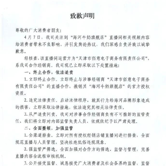 事件概述 - 天津海河乳品有限公司因其授权经销商“海河牛奶旗舰店”直播间出现主播低俗涉黄言论而发布致歉声明 [1][5] - 涉事直播间运营方为合作经销商“天津市佰意电子商务有限责任公司” [3][5] 公司处置措施 - 立即终止与涉事经销商“天津市佰意电子商务有限责任公司”的直播合作,并撤销其“海河牛奶旗舰店”的官方授权资质 [3] - 启动法律程序,追究涉事经销商给品牌形象造成损害的相关法律责任 [3] - 对内部监管失责人员依规依纪予以严肃处理 [3] - 立即对所有授权经销店铺直播间进行排查,全面规范直播与人员管理 [3] - 全面加强对合作方的筛选、监督与管理,完善直播内容全流程审核机制 [3] - 公开接受消费者及社会监督,并公布监督邮箱 [3] 公司背景与现状 - “海河”品牌始创于1957年,是中华老字号,在天津奶制品市场处于主导地位 [6] - 20世纪90年代以来,全国乳企竞争激烈,公司一度陷入亏损困境 [6] - “85后”董事长邹旸上任后,公司凭借多种口味创新的花式奶产品成功出圈 [6] - 公司声明坚守品质与道德底线,绝不为流量背弃初心,坚决守护品牌信誉与消费者权益 [4]