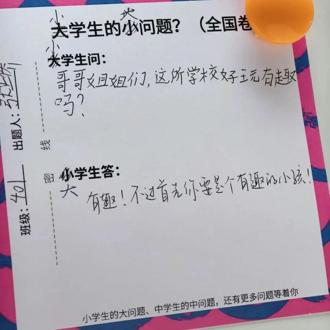 "天津大学有自己的解忧杂货铺" "大学生的难题 小学生秒给答案" 近日 天津大学图书馆留言板上的 一张张问答小卡片 在社交平台爆火 小学生的大问题、中学生的中问题,还有面多问题 学校图书馆开放的大小学生互动的活动 拍了一些很喜欢的,小朋友的回复看的很温暖, 当 小孩子真好啊 #天津大学 #大学生 #小学生 2 说点什么 ... > 10万+ > 1.6万 ( 7001 卡片 上 大学生写下自己的困惑 小学生 用童真作答 小学生提出奇思妙想 大学生报以深刻思考 中学生吐槽学习上的挫折 大学生给予温暖鼓励 有大学生纠结 "怎么能慢点长大?" 一位小学生回复道 "享受当下" 有大学生提问 "找不到快乐了怎么办?" 一位小学生的回答妙趣横生 "你看看《小猪佩奇》" 大学生的小问题?(全国卷) 大学生问: 找不到小夫よ了怎么办? 图 小学生答: KR有在(J T指1R奇) 好吸 小学生的大问题、中学生的中问题,还有更多问题等着你 在一条 "如何进入天津大学" 的提问下 有位小学生的回答 让人莞尔一笑后又陷入沉思 "开放日我就进来了!" 数 8 6 Kan K 出题人: 物观观的 निर् him F (全国卷) 大学生 ...