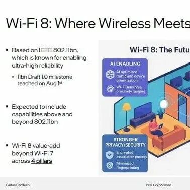 Wi-Fi 8 技术定位与核心目标 - 英特尔将Wi-Fi 8定位为“人工智能时代的核心连接技术”,旨在确保无线连接不成为访问海量计算与存储资源的性能瓶颈 [1] - 与前代技术聚焦“提速”不同,Wi-Fi 8的研发思路迎来小幅转变,其新增功能将以更精细、更实用的形态呈现,而非提升理论峰值速率或采用更宽信道 [1] - 核心目标是提升网络可靠性、降低时延并赋予更强的智能属性,以解决前代技术未能完全满足的用户痛点 [4] Wi-Fi 8 带来的关键性能提升 - 在相同传输距离内,用户将Wi-Fi 7设备更换为Wi-Fi 8设备后,可获得更高的数据传输速率 [1] - 通过“无缝漫游”技术,设备在不同无线接入点(AP)间切换的时延可从数十毫秒降至个位数毫秒级别,并实现零数据包丢失 [4] - 采用更智能的调制编码方案(MCS),允许每条数据流根据自身信号状况选择最优编码方案,从而提升链路可靠性与传输性能 [6] - 采用码字长度是Wi-Fi 7两倍的低密度奇偶校验(LDPC)编码技术,可实现更高效纠错,减少数据重传,并延长信号传输距离 [7] - 通过多无线接入点(AP)协同工作机制,可避免信号冲突,减少设备等待与重试的时间损耗 [7] Wi-Fi 8 的智能与环境感知能力 - 技术将大幅优化服务质量(QoS)功能,可精准识别低时延需求的网络流量(如视频会议、游戏)并赋予其传输优先级,以应对多类型流量共存的场景 [5] - 搭载基于无线电波的环境感知功能,设备能够精准检测自身与周边设备的距离和方位,实现距离测量、人员存在检测及手势识别 [5] - 赋予设备环境感知能力,可实现应用场景如:会议会话在笔记本电脑与手机间根据用户位置自动无缝切换、设备靠近自动唤醒、离开自动锁定等 [6] Wi-Fi 8 的技术规范与兼容性 - 将基于Wi-Fi 7的基础技术规范研发,支持2.4GHz、5GHz和6GHz三大无线频段,并采用320MHz信道带宽,是前代技术信道带宽的两倍 [8][9] - 具备向下兼容性,Wi-Fi 5/6/7终端设备可与Wi-Fi 8接入点互联互通,但无法享受新技术红利 [9] - 安全性全面升级,新增控制帧加密功能,支持IEEE P802.11bi标准,为Wi-Fi握手协议提供更强加密保护,进一步提升用户隐私安全 [8] 行业进展与公司策略 - 芯片制造商博通(Broadcom)近期已宣布推出Wi-Fi 8芯片产品组合 [9] - 英特尔计划等待相关认证标准落地后再推出产品,以确保不同厂商设备间能无缝协同工作,避免技术兼容问题 [9] - 该技术预计还需数年时间才会应用于终端设备 [1]