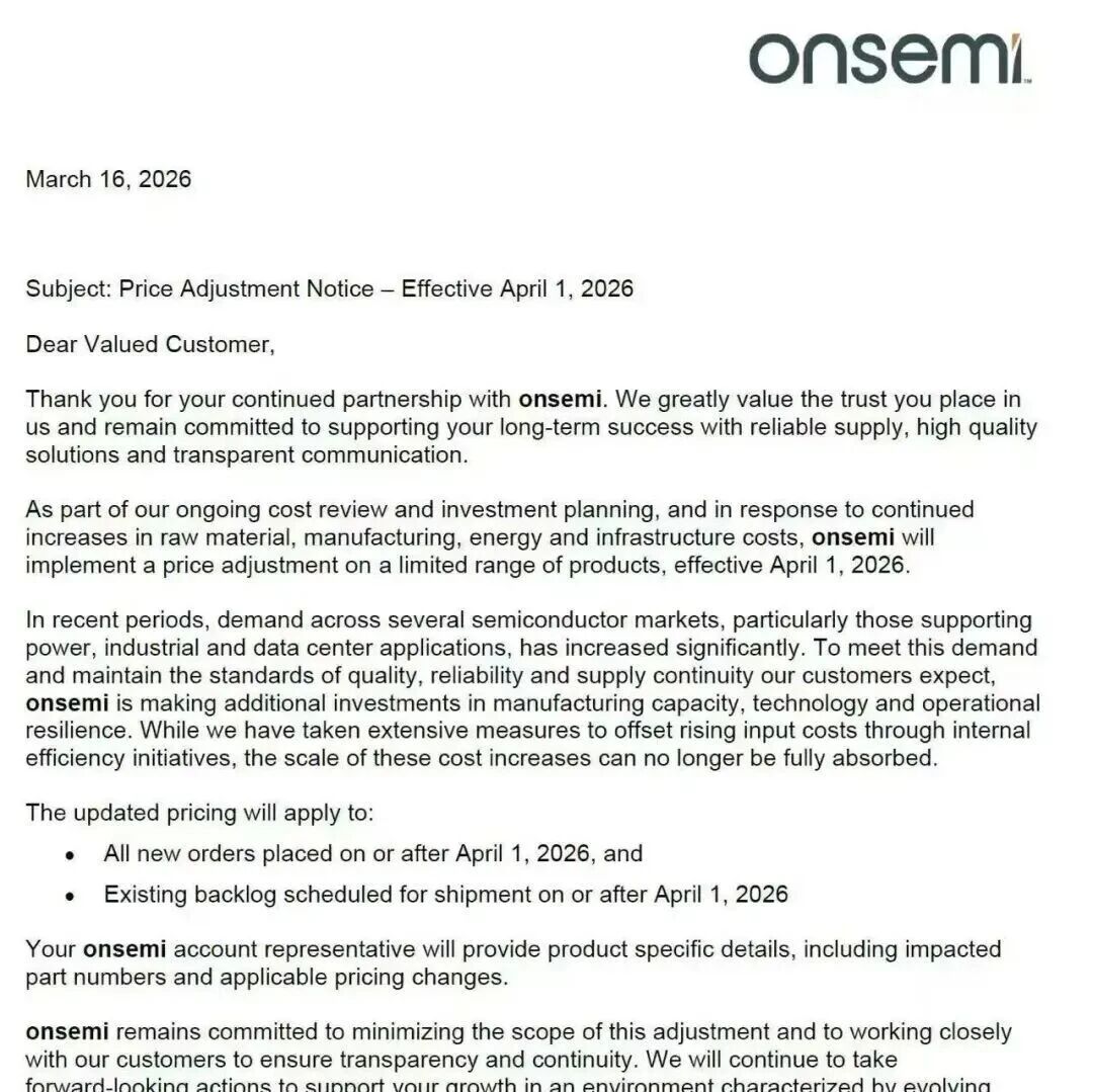 公司价格调整通知 - 安森美将于2026年4月1日起对部分产品实施价格调整 [2] - 价格调整适用于2026年4月1日或之后下达的所有新订单,以及原定于该日期或之后发货的现有积压订单 [2][9] - 公司销售与应用高级副总裁乔恩·伊姆佩拉托于2026年3月16日向客户发出正式调价通知函 [6][9] 价格调整原因 - 主要原因为原材料、制造、能源及基础设施成本持续上升 [2][6] - 尽管公司已采取内部增效举措,但成本增加规模已无法完全消化 [6] - 为维持客户所期望的质量、可靠性及供应持续性标准,公司正对制造产能、技术及运营韧性进行额外投资 [6] 行业与市场背景 - 多个半导体市场的需求显著增加,尤其是支持电力、工业及数据中心应用的市场 [6] - 公司表示将价格调整的范围降至最低,并与客户紧密合作以确保透明度和连续性 [7]