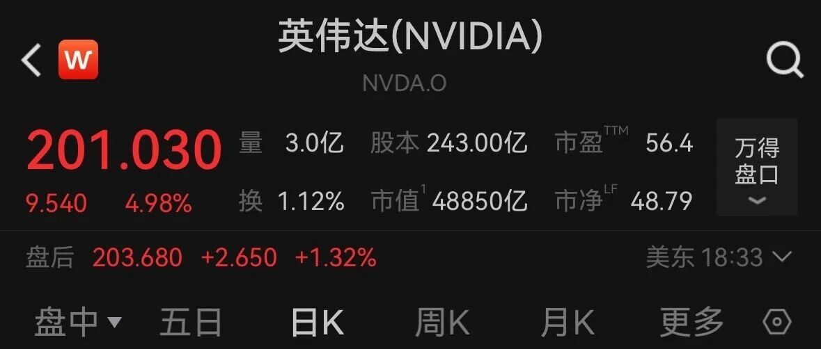 昨晚老黄在GTC 大会主题演讲刚刚结束 工业 AI 时代的操作系统: 正在扩展其用于模拟机器人队列的 "Mega"NVIDIA Omniverse 蓝图 ,以包括设计和模拟 工厂数字孪生 的技术。 点评:都在抢政府项目,尽快之前AMD称和美国能源部达成了 基建合作,供M430;现在英伟达也强势介入,部署11万颗Blackwell 芯片。 自动驾驶方面 ,nv 开始进入自动驾驶出租车环节,搜集实测数据,虽然它的实验室合成数据 全球最强,但端到端的 真实数据调优模型还是更有意义。 英伟达(NVIDIA) < W NVDA.O 201.030 量 3.0亿 股本 243.00亿 市盈"™ 56.4 万得 盘口 9.540 4.98% 换 1.12% 市值 48850亿 市净 48.79 盘后 203.680 +2.650 +1.32% 美东 18:33 √ 盘中▼ 五日 日K 周K 月K 电子 叠加 设均线 BBI:187.48 即复权 211.758 203.150 -> 156.979 10.808 200 10-28 2025-05-05 06-11 09-12 07-29 RSI(6,12) 83.74 7 ...