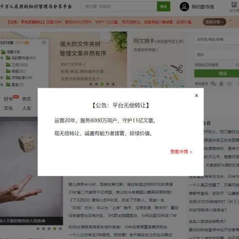 360doc个人图书馆网站近日发布停止运营公告:因无法在确保数据安全与服务延续的前提 下找到合适的接手方,网站将于2026年5月1日正式停止所有服务。即日起,360doc个人 图书馆网站暂停新内容发布,但登录、数据备份、VIP退费申请、钱包提现功能均正常开 放。 重要时间点提示 2026年5月1日前:请完成所有数据备份、钱包提现、退费申请。 2026年5月1日起:网站所有服务停止,服务器关闭。 据公开资料介绍,360doc个人图书馆是由北京六智信息技术有限公司运营的免费网络文章 收藏与分享平台,用户可通过注册建立个人数字图书馆,分类收藏、管理网页文章及文档, 支持Office、PDF等多种格式处理,并提供个性化域名服务,核心技术依托智能信息聚合引 擎(360doc ICE)实现自动化采集与语义理解。 此前报道 根据360doc个人图书馆1月24日发布的公告,因公司业务调整,决定将360doc个人图书馆 的全站平台资产(核心技术、数据及运营团队),向具备诚意与能力的伙伴进行无偿转让。 360doc个人图书馆创始人蔡智在致用户的一封信中回顾称,2005年其休产假在家,一边 照顾新生的孩子,一边在电脑上敲下了360 ...