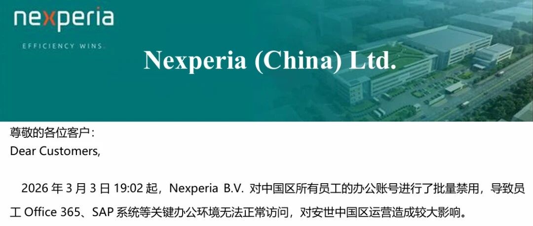 核心事件概述 - 安世半导体(中国)有限公司发布公告,披露其母公司安世荷兰自2026年3月3日19:02起批量禁用了中国区所有员工的办公账号 [1] - 此操作导致员工无法访问Office 365、SAP系统等关键办公环境,对公司运营造成较大冲击 [1] - 公司已启动应急预案,截至公告发布时大部分业务已恢复运行,基本生产运营得到保障 [1] 事件影响与应对 - 部分生产流程中断,特别是“客供晶圆到厂后的SAP下单转生产”环节 [1] - 已在SAP中开单并进入生产流程的订单未受影响 [1] - 中国区IT与业务部门协同优先恢复关键系统与生产调度 [1] - 公司正全力降低事件对后续生产和交付的潜在影响 [1]