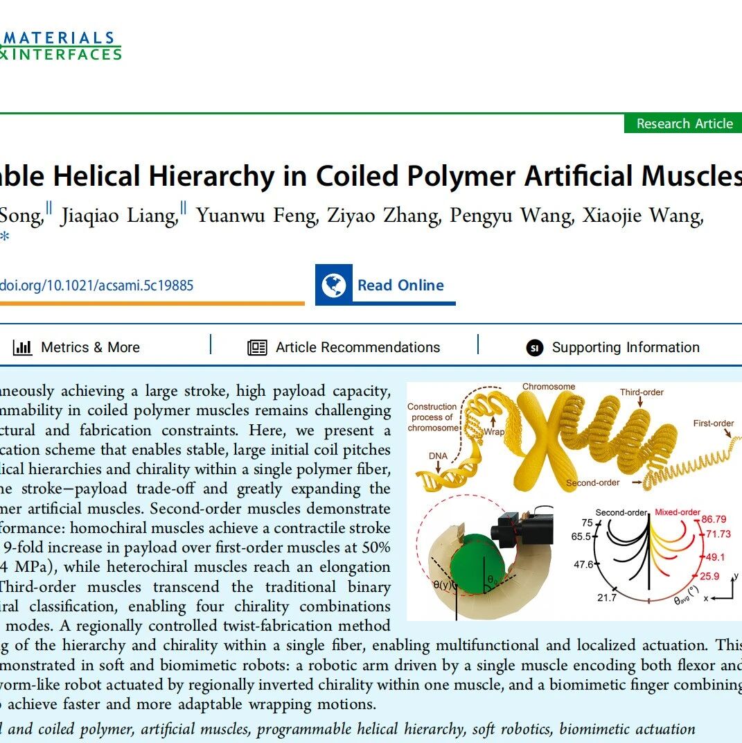 让 软体机器人既拥有大变形能力,又具备强劲的负载力,一直是科学家们头痛的难题。这背后,是传统人造 肌肉结构中的一道 "先天枷锁":要想变形大,结构就得松;要想力气大,结构就得紧。 最近,华南理工大学 周奕彤 课题组 (课题组网站: http://www.zhouyitonglab.com/index.html) 从 生命最 精密的 的 "压缩 程序 "染色体身上找到了 关键 灵感。他们模仿染色体多层次螺旋折叠的结构,在单根聚合 物纤维中,首次实现了可编程的多级螺旋结构,一举突破了人造肌肉中 "大变形"与"高负载"不可兼得的经典 困境。这项 突破性 研究于近期 已 发表在材料科学知名期刊《 ACS Applied Materials & Interfaces 》 上。 | | | 二级螺旋:把一根已经盘好的弹簧作为新绳索,再次盘绕成更大的弹簧 , 结构立刻复杂起来。 三级螺旋:将二级结构进行第三次盘绕,形成极其复杂的 "弹簧的弹簧的弹簧"。 ▍ 灵感来源:生命自带的 "压缩算法" 为什么染色体能成为灵感源泉?想象一下,长达数米的 DNA 链如何有序地折叠进微米级的细胞核里?答案就 是多层次螺旋结构。染色体通过一 ...