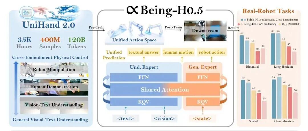 文章核心观点 - 一款名为Being-H0.5的模型通过整合全球主流机器人构型数据,打破了具身智能领域依赖单一本体数据积累的“马太效应”行业逻辑,展现出惊人的跨本体泛化能力[3] - 该模型的核心突破在于构建了全球规模最大的跨本体训练数据集UniHand-2.0,并创新性地采用了以人为中心的训练范式,将人类视频作为所有下游机器人的“原型模板”[6][11][13] - 在真机验证和基准测试中,模型性能超越了当前已知的VLA模型,其成功可能为行业开启一个打破数据壁垒、降低开发成本的泛化新时代[18][19] 根据相关目录分别进行总结 构建全球规模最大的训练数据集UniHand-2.0 - 数据集涵盖超过14,000小时的机器人操作数据与16,000小时的人类视频数据,总训练token数突破4000亿,规模达到Qwen2.5-VL的十分之一[6] - 首次实现了跨本体的大规模数据融合,汇集了超过30种不同硬件构型的数据,解决了以往异构本体数据难以统一训练的挑战[8] - 创新性地提出了统一动作空间框架,将双足人形、轮式底盘、桌面机械臂等形态各异的机器人映射到同一特征表示空间,支撑跨本体联合训练[10] 以人为中心的训练范式 - 在上一代H0基础上,将人类视频训练数据提升了2个数量级,通过16,000小时的庞大体量构建了全球最大的人类视频数据集[11] - 设计了一套名为UniCraftor的便携、可扩展、低成本的人类视频采集系统,以解决人类视频普遍缺乏高质量标注的痛点[11] - 人类视频蕴含海量即兴意图,覆盖了下游场景几乎所有任务类型,能有效避免模型在预训练过程中坍缩到单一的低维流形,实现跨本体泛化[13] - 人类视频蕴含丰富的物理与空间先验信息,赋予了模型仅靠实验室数据所不具备的场景泛化能力[14] 模型架构与技术方法 - Being-H0.5是一个专门的专家混合模型,解耦了多模态理解与动作生成功能,同时通过共享的注意力机制保持两者的耦合[17] - 通过一个统一的状态-动作空间,将人手动作和多样化的机器人控制映射到语义对齐的槽位,支持跨实体形态的预训练[17] - 预训练将多模态数据序列化为统一的问答式格式,并将每种模态分配给相应的专家分支[17] - 采用“混合流”设计,结合共享的基础层与用于特定实体形态/任务动态的路由式专用专家,实现了动作生成能力的扩展[17] 真机验证与基准测试结果 - 在PND、G1、Franka等不同构型的人形机器人、机械臂本体上进行了大量真机实验,模型展现出卓越的跨本体与复杂任务执行能力,例如完成“用按压喷壶浇花”这类以往夹爪式机器人难以实现的操作[18] - 在LIBERO、RoboCasa等广泛使用的评测基准上,模型在仅依赖模仿学习与纯RGB视觉输入的条件下,平均取得了98.9%与54%的成功率[18] - 该性能超越了π-0.5、GR00T等所有已知VLA模型,甚至优于部分借助强化学习与3D模态的方案[18] 行业影响 - Being-H0.5的出现对国内外绝大多数具身公司而言是一大利好,本体公司可能不再需要投入上亿成本自建数据采集中心、依靠自身本体数据构筑算法护城河[19] - 该模型为“如何适配不同构型本体、获取高质量数据”这一行业难题提供了一个答案,即人类本身才是最大、最自然的数据来源[19]