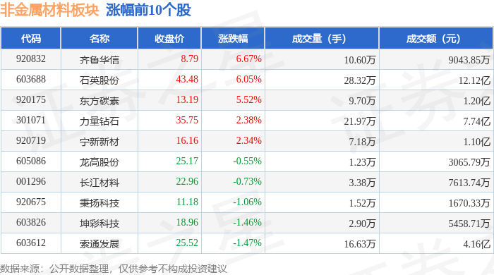 板块整体表现 - 非金属材料板块在10月13日整体上涨0.52%,表现优于大盘,当日上证指数下跌0.19%,深证成指下跌0.93% [1] - 板块内个股表现分化,领涨股为齐鲁华信,涨幅达6.67%,收盘价为8.79元 [1] - 板块资金呈净流出状态,主力资金净流出8011.14万元,游资资金净流出1924.34万元,散户资金净流入9935.48万元 [2] 领涨个股表现 - 石英股份涨幅为6.05%,收盘价为43.48元,成交量为28.32万手,成交额为12.12亿元 [1] - 东方恢震涨幅为5.52%,收盘价为13.19元,成交量为9.70万手,成交额为1.20亿元 [1] - 力量钻石涨幅为2.38%,收盘价为35.75元,成交量为21.97万手,成交额为7.74亿元,是当日主力资金唯一净流入的个股,净流入1391.68万元,主力净占比1.80% [1][2][3] 领跌个股表现 - 联瑞新材跌幅最大,为4.56%,收盘价为60.51元,成交量为7.51万手,成交额为4.54亿元,主力资金净流出2150.50万元 [2][3] - 天马新材跌幅为1.93%,收盘价为39.68元,成交量为3.88万手,成交额为1.52亿元 [2] - 索通发展跌幅为1.47%,收盘价为25.52元,成交量为16.63万手,成交额为4.16亿元,主力资金净流出2498.10万元 [1][2][3] 个股资金流向 - 石英股份主力资金净流出3200.39万元,游资资金净流出2958.98万元,但散户资金净流入6159.36万元,散户净占比5.08% [3] - 坤彩科技主力资金净流出831.30万元,主力净占比-15.23%,但游资和散户资金分别净流入212.62万元和618.69万元 [3] - 长江材料主力资金净流出431.02万元,游资资金净流出797.20万元,但散户资金净流入1228.22万元,散户净占比高达16.13% [3]