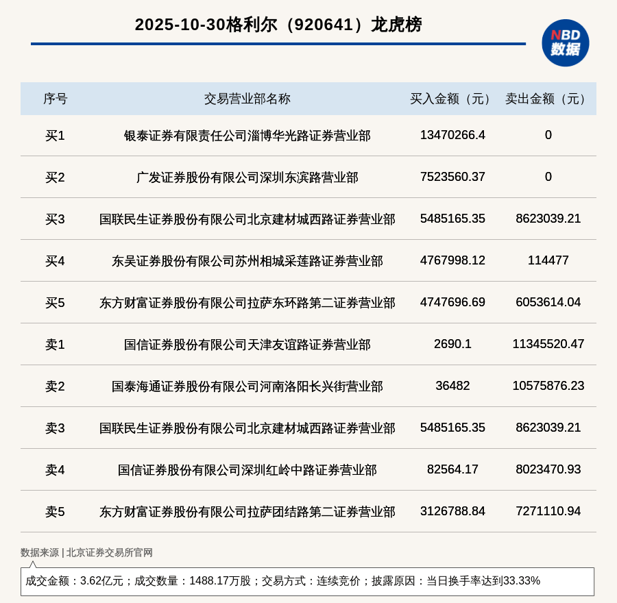 北交所上市公司格利尔登龙虎榜:当日换手率达到33.33%