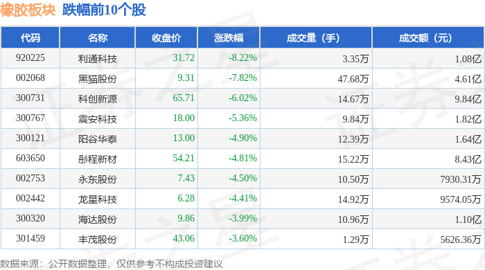 橡胶板块市场表现 - 11月21日橡胶板块整体下跌3.31%,表现弱于大盘,当日上证指数下跌2.45%,深证成指下跌3.41% [1] - 板块内个股普跌,领跌个股为利通科技(下跌13.94%)和远翔新材(下跌11.41%) [2] - 板块内唯一上涨个股为彤程新材,涨幅2.81% [1] 个股价格与交易情况 - 彤程新材收盘价42.87元,成交额20.27亿元,成交量47.02万手 [1] - 利通科技收盘价35.20元,成交额2.39亿元,成交量6.56万手 [2] - 科创新源成交额6.28亿元,为披露个股中最高 [2] 板块资金流向 - 橡胶板块整体主力资金净流出1492.91万元,游资资金净流入1.66亿元,散户资金净流出1.51亿元 [2] - 科创新源获得主力资金净流入4157.67万元,主力净占比6.62%,同时获得游资净流入8572.66万元 [3] - 龙星科技获得主力资金净流入3152.86万元,主力净占比高达25.92% [3] - 彤程新材虽股价上涨,但游资净流出5198.32万元 [3]