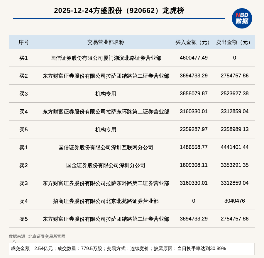 每经讯,2025年12月24日,北交所上市公司方盛股份(920662,收盘价:31.27元)登上龙虎榜,交易方式是连续竞价,披露原 因是当日换手率达到30.89%,成交数量779.5万股,成交金额2.54亿元。买一席位为国信证券股份有限公司厦门湖滨北路证券营 业部,买入460.05万元;卖一席位为国信证券股份有限公司深圳互联网分公司,卖出444.14万元。 | | 2025-12-24方盛股份 (920662) 龙虎榜 | | | | --- | --- | --- | --- | | 序号 | 交易营业部名称 | 买入金额(元) | 卖出金额(元) | | ポリ | 国信证券股份有限公司厦门湖滨北路证券营业部 | 4600477.49 | 0 | | 买2 | 东方财富证券股份有限公司拉萨团结路第二证券营业部 | 3894733.29 | 2754757.86 | | 买3 | 机构专用 | 3858079.87 | 2523627.38 | | द्र 4 | 东方财富证券股份有限公司拉萨东环路第二证券营业部 | 3160330.01 | 3312859.04 | | જેટ | 机构专用 | 23592 ...