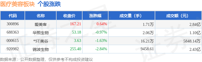 证券之星消息,10月20日医疗美容板块较上一交易日下跌0.94%,锦波生物领跌。当日上证指数报收于 3863.89,上涨0.63%。深证成指报收于12813.21,上涨0.98%。医疗美容板块个股涨跌见下表: | 代码 | | | 名称 | | | | | --- | --- | --- | --- | --- | --- | --- | | 000615 *ST美谷 | 28.73万 | 0.75% | 15.35万 | 0.40% | -44.08万 | -1.15% | | 688363 华熙生物 | -1241.84万 | -8.64% | 562.12万 | 3.91% | 679.72万 | 4.73% | | 300896 爱美客 | -2910.27万 | -6.24% | -2199.57万 | -4.71% | 5109.84万 | 10.95% | 以上内容为证券之星据公开信息整理,由AI算法生成(网信算备310104345710301240019号),不构成投资建议。 | 代码 | 名称 | 收盘价 | 涨跌幅 | 成交量(手) | 成交额(元) | | | --- | --- | - ...