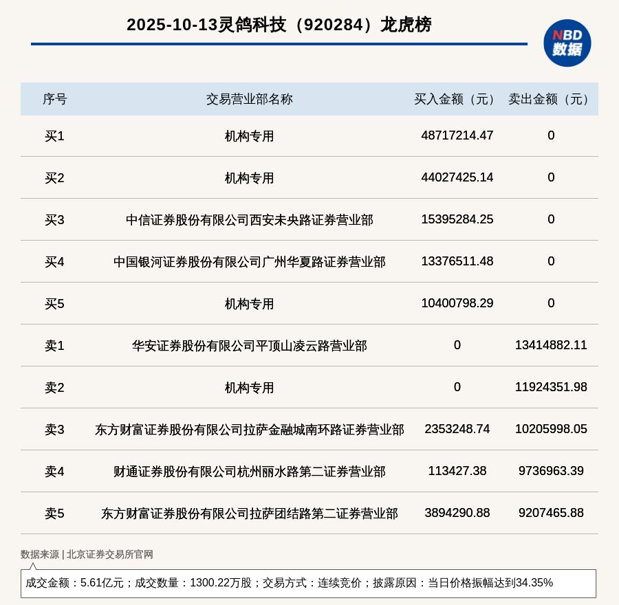 公司交易概况 - 灵鸽科技于2025年10月13日登上龙虎榜,交易方式为连续竞价,披露原因是当日价格振幅达到34.35% [1] - 当日成交数量为1300.22万股,成交金额为5.61亿元 [1] 龙虎榜买卖席位分析 - 买入金额最大的席位为机构专用,买入4871.72万元 [1][2] - 买入前五席位中,机构专用席位占据三席,合计买入金额超过1.03亿元 [2] - 卖出金额最大的席位为华安证券股份有限公司平顶山凌云路营业部,卖出1341.49万元 [1][2] - 卖出前五席位中包含一个机构专用席位,卖出1192.44万元 [2]