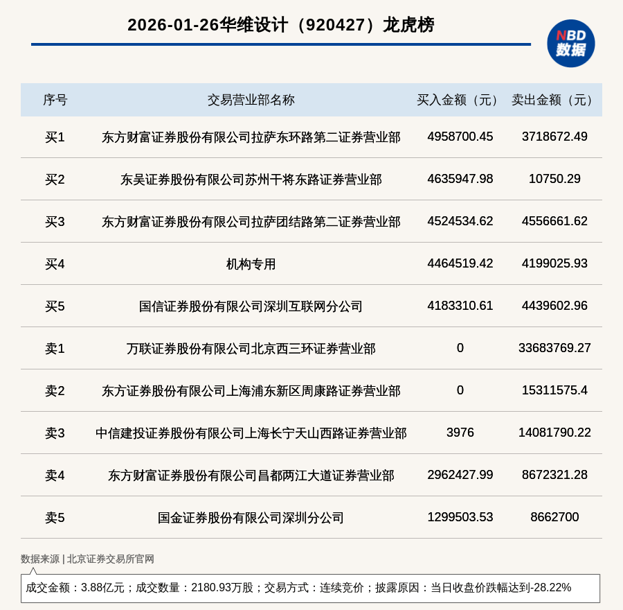 免责声明:本文内容与数据仅供参考,不构成投资建议,使用前核实。据此操作,风险自担。 每日经济新闻 (记者 曾健辉) 每经讯,2026年1月21日,北交所上市公司华维设计(920427,收盘价:18.22元)登上龙虎榜,交易方式是连续竞价,披露原因 是当日收盘价涨幅达到29.96%,成交数量1404.85万股,成交金额2.48亿元。买一席位为中信建投证券股份有限公司湖州人民路 证券营业部,买入1589.02万元;卖一席位为东方证券股份有限公司上海杨浦区控江路证券营业部,卖出801.68万元。 | | 2026-01-21华维设计(920427) 龙虎榜 | | | | --- | --- | --- | --- | | 序号 | 交易营业部名称 | 买入金额(元) 卖出金额(元) | | | नेट ग | 中信建投证券股份有限公司湖州人民路证券营业部 | 15890226.82 | 0 | | ਐੱਨ | 金融街证券股份有限公司上海第二分公司 | 9448248.97 | 0 | | 址3 | 东莞证券股份有限公司揭阳分公司 | 7491237.01 | 0 | | में प | 国泰海通证券股份有限公司重 ...