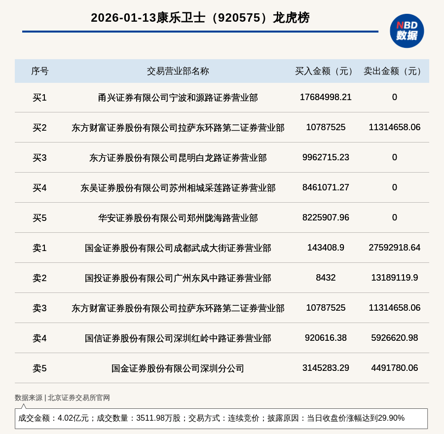 康乐卫士龙虎榜交易概况 - 2026年1月13日,北交所上市公司康乐卫士因收盘价涨幅达到29.90%登上龙虎榜,成交数量为3511.98万股,成交金额为4.02亿元 [1] - 交易方式为连续竞价 [1] 买卖席位及金额详情 - 买入金额排名第一的席位为甬兴证券有限公司宁波和源路证券营业部,买入金额为1768.5万元 [1] - 卖出金额排名第一的席位为国金证券股份有限公司成都武成大街证券营业部,卖出金额为2759.29万元 [1] - 龙虎榜数据显示,买入前五席位合计买入金额显著,其中甬兴证券宁波和源路营业部买入约1768.50万元,东方财富证券拉萨东环路第二营业部买入约1078.75万元,东方证券昆明白龙路营业部买入约996.27万元,东吴证券苏州相城采莲路营业部买入约846.11万元,华安证券郑州陇海路营业部买入约822.59万元 [2] - 卖出前五席位中,国金证券成都武成大街营业部卖出约2759.29万元,国投证券广州东风中路营业部卖出约1318.91万元,东方财富证券拉萨东环路第二营业部卖出约1131.47万元,国信证券深圳红岭中路营业部卖出约592.66万元,国金证券深圳分公司卖出约449.18万元 [2] - 部分营业部同时出现在买卖双方,例如东方财富证券股份有限公司拉萨东环路第二证券营业部在买入约1078.75万元的同时,也卖出了约1131.47万元 [2]