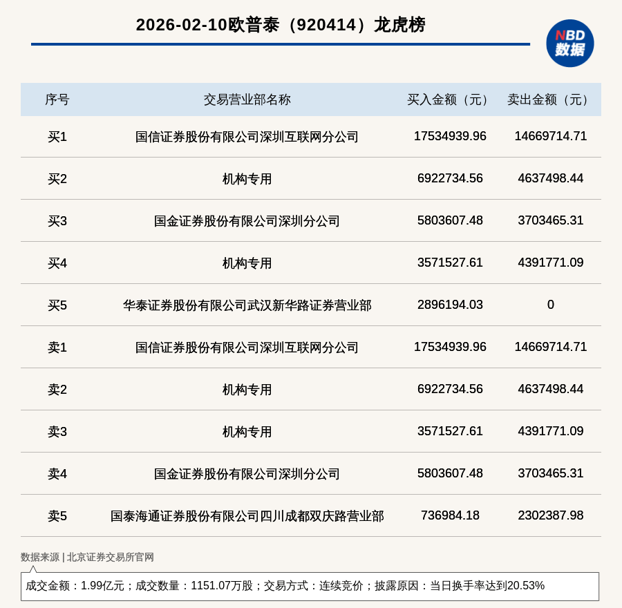 龙虎榜交易概况 - 2026年2月9日,北交所上市公司欧普泰因当日换手率达到27.95%登上龙虎榜,交易方式为连续竞价 [1] - 当日成交数量为1567.21万股,成交金额为2.91亿元 [1] 买卖席位与资金流向 - 买入金额排名第一的席位为国信证券股份有限公司深圳互联网分公司,买入1455.20万元 [1][2] - 卖出金额排名第一的席位同样为国信证券股份有限公司深圳互联网分公司,卖出969.65万元 [1][2] - 机构专用席位在当日同时出现在买卖双方,买入491.33万元,卖出795.42万元 [2] - 东方财富证券股份有限公司旗下两个营业部(上海东方路证券营业部、拉萨东环路第二证券营业部)均出现在龙虎榜上,分别买入973.09万元和506.40万元 [2]