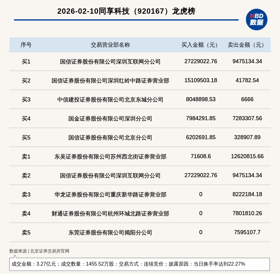 龙虎榜交易概况 - 2026年2月10日,北交所上市公司同享科技因当日换手率达到22.27%登上龙虎榜,交易方式为连续竞价 [1] - 当日成交数量为1455.52万股,成交金额为3.27亿元 [1] 买卖席位及金额 - 买入金额最大的席位为国信证券股份有限公司深圳互联网分公司,买入2722.9万元 [1] - 卖出金额最大的席位为东吴证券股份有限公司苏州西北街证券营业部,卖出1262.08万元 [1] - 龙虎榜数据显示,买入前五席位合计买入金额约为6460.3万元,卖出前五席位合计卖出金额约为4605.8万元 [2]
