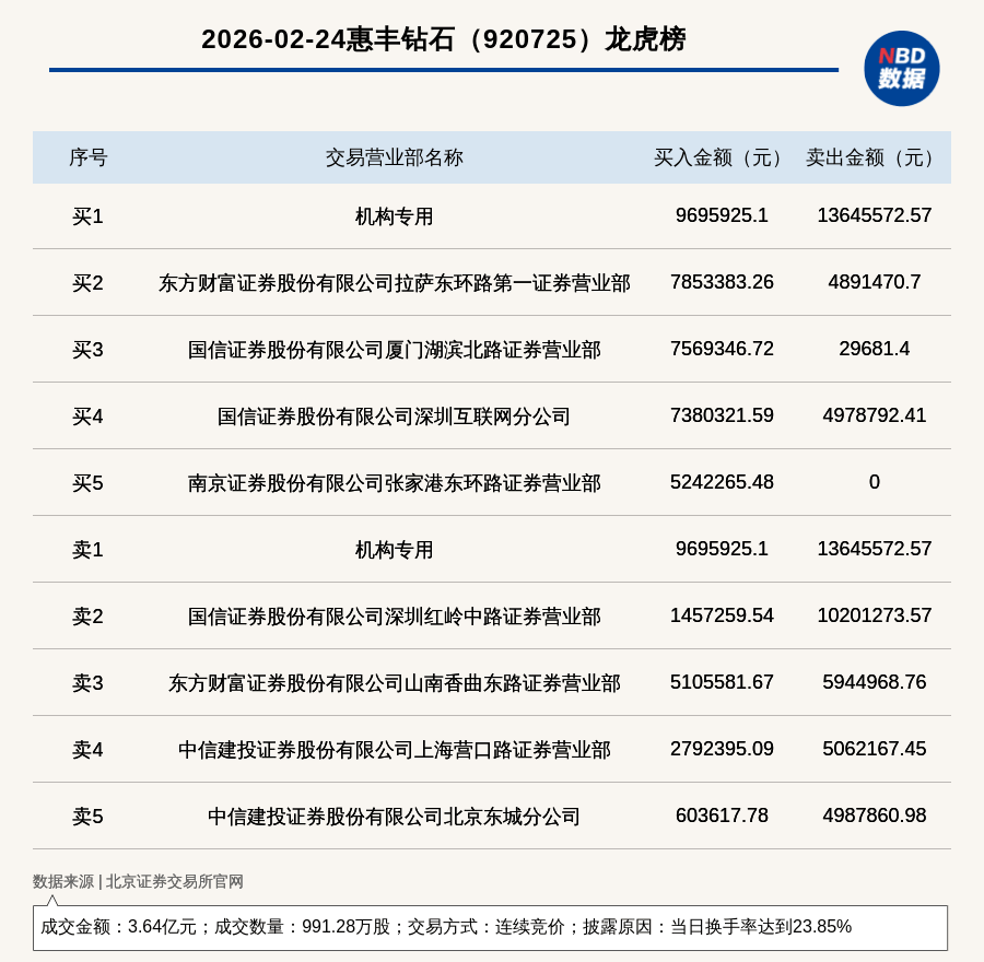 龙虎榜交易概况 - 2026年2月24日,北交所上市公司惠丰钻石因当日换手率达到23.85%登上龙虎榜,交易方式为连续竞价 [1] - 当日成交数量为991.28万股,成交金额为3.64亿元 [1] - 买一席位为机构专用,买入金额为969.59万元;卖一席位同样为机构专用,卖出金额为1364.56万元 [1] 买卖席位详细数据 - 机构专用席位同时位列买一和卖一,买入969.59万元,卖出1364.56万元,呈现净卖出状态 [2] - 买入金额第二高的席位为东方财富证券股份有限公司拉萨东环路第一证券营业部,买入785.34万元,同时卖出489.15万元 [2] - 买入金额第三高的席位为国信证券股份有限公司厦门湖滨北路证券营业部,买入756.93万元,卖出29.68万元 [2] - 卖出金额第二高的席位为国信证券股份有限公司深圳红岭中路证券营业部,卖出1020.13万元,买入145.73万元 [2] - 卖出金额第三高的席位为东方财富证券股份有限公司山南香曲东路证券营业部,卖出594.50万元,买入510.56万元 [2]