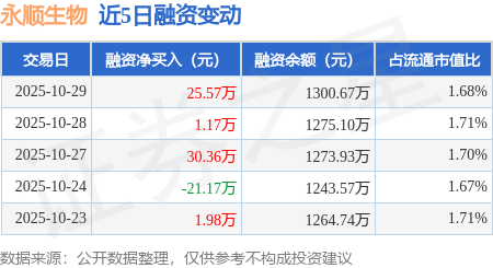 永顺生物:10月29日融资净买入25.57万元,连续3日累计净买入57.1万元