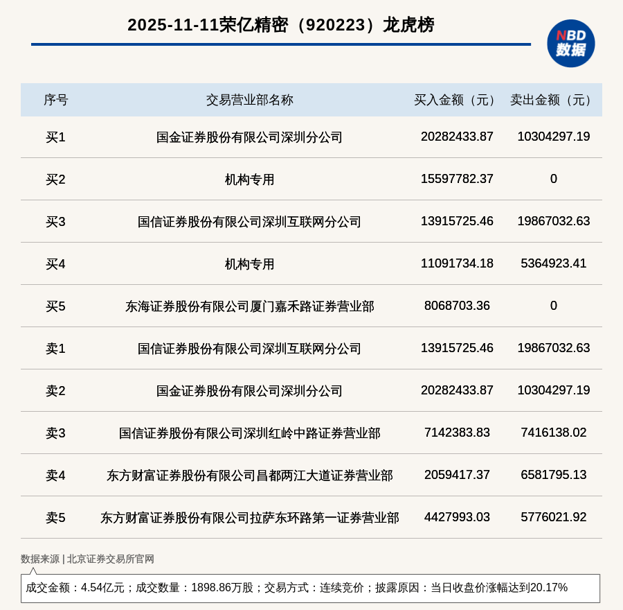 股价异动概况 - 荣亿精密于2025年11月11日因收盘价涨幅达到20.17%登上北交所龙虎榜 [1] - 当日成交数量为1898.86万股,成交金额为4.54亿元 [1] - 交易方式为连续竞价 [1] 龙虎榜交易席位分析 - 买入金额排名第一的席位为国金证券股份有限公司深圳分公司,买入2028.24万元 [1],具体金额为20,282,433.87元 [2] - 卖出金额排名第一的席位为国信证券股份有限公司深圳互联网分公司,卖出1986.7万元 [1],具体金额为19,867,032.63元 [2] - 龙虎榜中出现两个机构专用席位,分别买入15,597,782.37元和11,091,734.18元 [2] - 卖出席位中国信证券深圳红岭中路营业部卖出7,416,138.02元,东方财富证券昌都两江大道营业部卖出6,581,795.13元 [2]