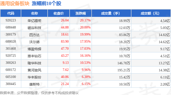 板块整体表现 - 11月11日通用设备板块整体上涨0.52%,而同日上证指数下跌0.39%,深证成指下跌1.03%,板块表现强于大盘 [1] - 板块内资金流向显示主力资金净流入1.24亿元,游资资金净流出2.3亿元,散户资金净流入1.06亿元 [2] 领涨个股表现 - 荣亿精密领涨板块,收盘价26.04元,单日涨幅达20.17%,成交额4.54亿元 [1] - 磁谷科技涨幅20.00%,收盘价44.88元,成交额5.05亿元 [1] - 四方达涨幅19.99%,收盘价18.61元,成交额14.82亿元,主力资金净流入3.01亿元,净占比20.29% [1][3] - 沃尔德涨幅17.95%,收盘价83.90元,成交额14.62亿元 [1] - 博盈特焊涨幅17.03%,收盘价47.70元,成交额9.17亿元,主力资金净流入1.16亿元,净占比12.66% [1][3] 跟涨个股表现 - 惠丰钻石涨幅16.16%,收盘价43.27元,成交额4.51亿元 [1] - 隆华科技涨幅10.53%,收盘价9.13元,成交额13.27亿元,主力资金净流入1.73亿元,净占比13.02% [1][3] - 黄河旋风涨幅9.96%,收盘价7.62元,成交额14.38亿元,主力资金净流入2.81亿元,净占比19.57% [1][3] - 来丰股份涨幅6.38%,收盘价40.86元,成交额6.11亿元 [1] - 康斯特涨幅6.15%,收盘价21.24元,成交额2.20亿元 [1] 领跌个股表现 - 鼎泰高科跌幅7.15%,收盘价107.02元,成交额16.12亿元 [2] - 联德股份跌幅6.61%,收盘价39.69元,成交额4.42亿元 [2] - 雪人集团跌幅6.00%,收盘价14.10元,成交额36.34亿元 [2] - 新天科技跌幅5.43%,收盘价4.88元,成交额4.28亿元 [2] 其他活跃个股资金流向 - 宗申动力主力资金净流入1.63亿元,净占比11.94% [3] - 国机精工主力资金净流入1.43亿元,净占比13.83% [3] - 五洲新春主力资金净流入1.25亿元,净占比6.40% [3] - 新莱应材主力资金净流入7592.37万元,净占比5.93%,游资净流入1530.69万元 [3] - 哈焊华通主力资金净流入7130.61万元,净占比8.96%,游资净流入4709.67万元 [3]
