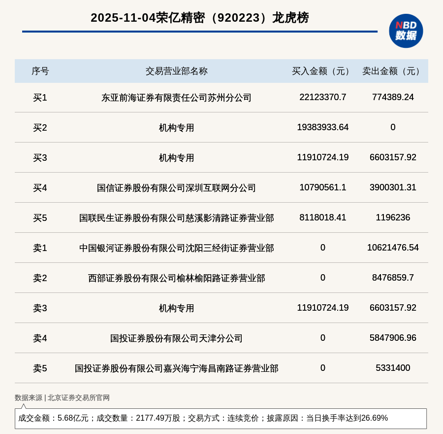 机构席位买入2668.95万 北交所上市公司荣亿精密登龙虎榜