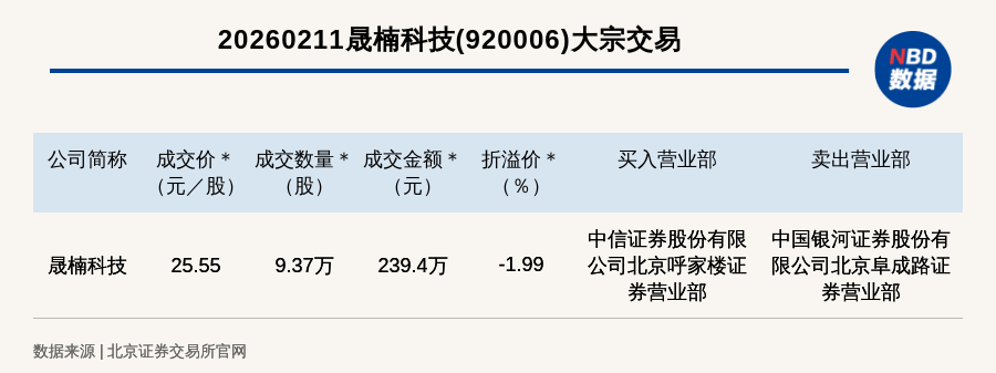 公司交易动态 - 2026年2月11日,北交所上市公司晟楠科技发生一笔大宗交易,成交价为25.55元/股,成交数量为9.37万股,成交金额为239.4万元 [1] - 该笔大宗交易成交价较当日收盘价26.07元折价1.99% [1] - 买入方营业部为中信证券股份有限公司北京呼家楼证券营业部,卖出方营业部为中国银河证券股份有限公司北京阜成路证券营业部 [1]
