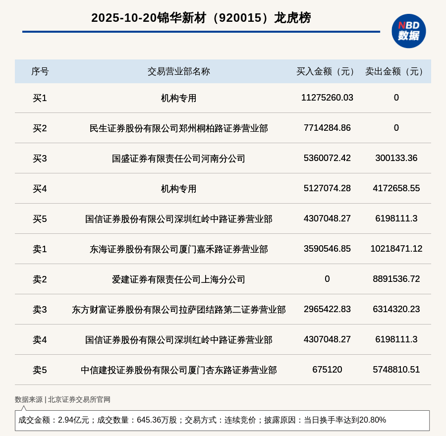 机构席位买入1640.23万 北交所上市公司锦华新材登龙虎榜