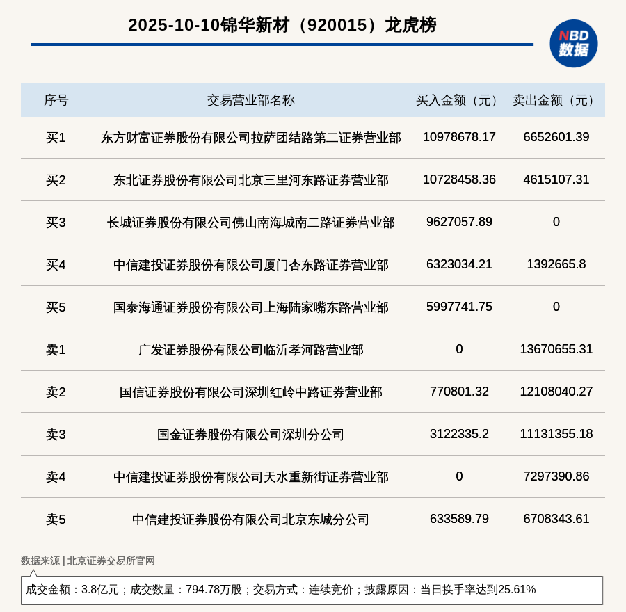核心观点 - 锦华新材因单日换手率异常高而登上龙虎榜 显示交易活跃度极高 [1] 龙虎榜交易概况 - 交易日期为2025年10月10日 交易方式为连续竞价 [1] - 当日换手率达到25.61% 成交数量为794.78万股 成交金额为3.8亿元 [1] 买卖席位分析 - 买入金额最大的席位为东方财富证券拉萨团结路第二证券营业部 买入1097.87万元 [1] - 卖出金额最大的席位为广发证券临沂孝河路营业部 卖出1367.07万元 [1] - 买入前五席位总买入金额超过3800万元 卖出前五席位总卖出金额超过4300万元 [2]