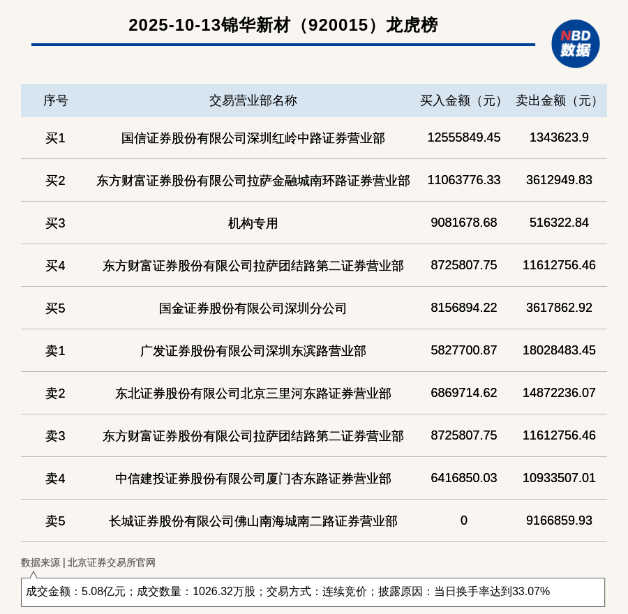 每经讯,2025年10月13日,北交所上市公司锦华新材(920015,收盘价:53元)登上龙虎榜,交易方式是连续竞价,披露原因 是当日换手率达到33.07%,成交数量1026.32万股,成交金额5.08亿元。买一席位为国信证券股份有限公司深圳红岭中路证券营 业部,买入1255.58万元;卖一席位为广发证券股份有限公司深圳东滨路营业部,卖出1802.85万元。 每日经济新闻 (记者 曾健辉) 免责声明:本文内容与数据仅供参考,不构成投资建议,使用前核实。据此操作,风险自担。 ...