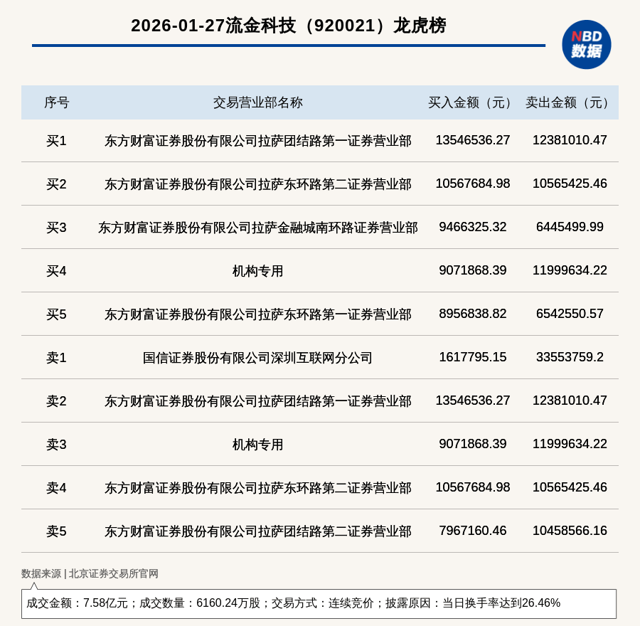 公司交易异动 - 北交所上市公司流金科技(证券代码:920021)于2026年1月27日登上龙虎榜 [1] - 上榜原因为当日换手率达到26.46% [1] - 当日成交数量为6160.24万股,成交金额为7.58亿元 [1] - 交易方式为连续竞价 [1] 龙虎榜席位交易详情 - 买入金额第一的席位为东方财富证券股份有限公司拉萨团结路第一证券营业部,买入1354.65万元 [1] - 卖出金额第一的席位为国信证券股份有限公司深圳互联网分公司,卖出3355.38万元 [1]