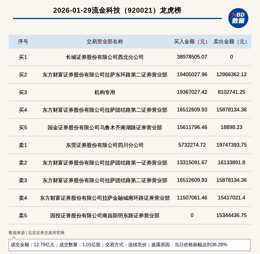龙虎榜交易数据 - 2026年1月29日,北交所上市公司流金科技因当日价格振幅达到36.28%登上龙虎榜 [1] - 当日成交数量为1.01亿股,成交金额为12.79亿元 [1] - 交易方式为连续竞价 [1] 买卖席位详情 - 买入金额第一的席位为长城证券股份有限公司西北分公司,买入3897.85万元 [1][2] - 卖出金额第一的席位为东莞证券股份有限公司四川分公司,卖出1974.74万元 [1][2] - 买入金额第二的席位为东方财富证券股份有限公司拉萨东环路第二证券营业部,买入1940.50万元 [2] - 机构专用席位出现在买方第三位,买入1936.70万元,同时卖出810.27万元 [2] - 国投证券股份有限公司南昌阳明东路证券营业部为卖出金额第五的席位,卖出1534.44万元 [2]