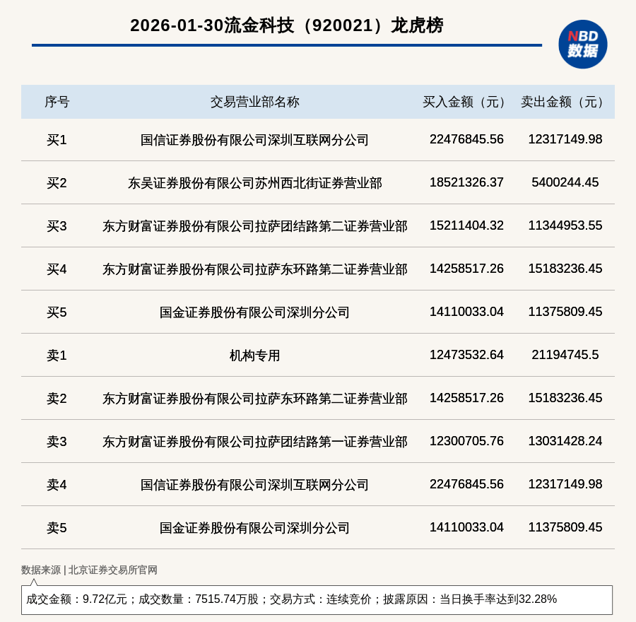 (记者 曾健辉) 每经讯,2026年1月30日,北交所上市公司流金科技(920021,收盘价:13.1元)登上龙虎榜,交易方式是连续竞价,披露原因 是当日换手率达到32.28%,成交数量7515.74万股,成交金额9.72亿元。买一席位为国信证券股份有限公司深圳互联网分公司, 买入2247.68万元;卖一席位为机构专用,卖出2119.47万元。 | | 2026-01-30流金科技 (920021) 龙虎榜 | | | | --- | --- | --- | --- | | 序号 | 交易营业部名称 | 买入金额(元) | 卖出金额(元) | | ਜੇਟ ਹ | 国信证券股份有限公司深圳互联网分公司 | 22476845.56 | 12317149.98 | | 买2 | 东吴证券股份有限公司苏州西北街证券营业部 | 18521326.37 | 5400244 45 | | 买3 | 东方财富证券股份有限公司拉萨团结路第二证券营业部 | 15211404.32 | 11344953.55 | | ग्रेडर | 东方财富证券股份有限公司拉萨东环路第二证券营业部 | 14258517.26 | 1518323 ...
