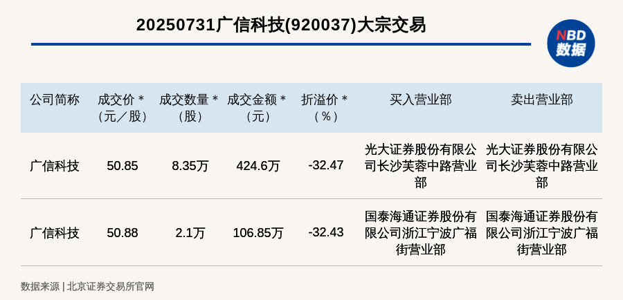 每经讯,2025年7月31日,北交所上市公司广信科技(920037,收盘价:75.3元)发生2笔大宗交易,折价率最高的一笔成交价 50.85元/股,成交数量8.35万股,成交金额424.6万元,折价32.47%。买入营业部是光大证券股份有限公司长沙芙蓉中路营业部, 卖出营业部是光大证券股份有限公司长沙芙蓉中路营业部。 | | 20250731广信科技(920037)大宗交易 | | | | | | --- | --- | --- | --- | --- | --- | | 公司简称 | 成交价 * 成交数量 * 成交金额 * (元/股) | (股) | (元) | 折溢价 * ( % ) | 买入营业部 卖出营业部 | | 广信科技 | 50.85 | 8.35万 | 424 6万 | -32.47 | 光大证券股份有限公 光大证券股份有限公 司长沙芙蓉中路营业 司长沙芙蓉中路营业 | | | | | | | 部 場 | | | | | | | 国泰海通证券股份有 国泰海通证券股份有 | | 广信科技 | 50.88 | 2.1万 | 106.85万 | -32 43 | 限公司浙江宁波广福 限公司浙江宁波广 ...