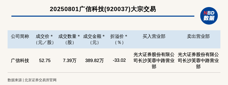 (记者 张喜威) 免责声明:本文内容与数据仅供参考,不构成投资建议,使用前核实。据此操作,风险自担。 每日经济新闻 每经讯,2025年8月1日,北交所上市公司广信科技(920037,收盘价:78.75元)发生一笔大宗交易,成交价52.75元/股,成交 数量7.39万股,成交金额389.82万元,折价33.02%。买入营业部是光大证券股份有限公司长沙芙蓉中路营业部,卖出营业部是光 大证券股份有限公司长沙芙蓉中路营业部。 ...