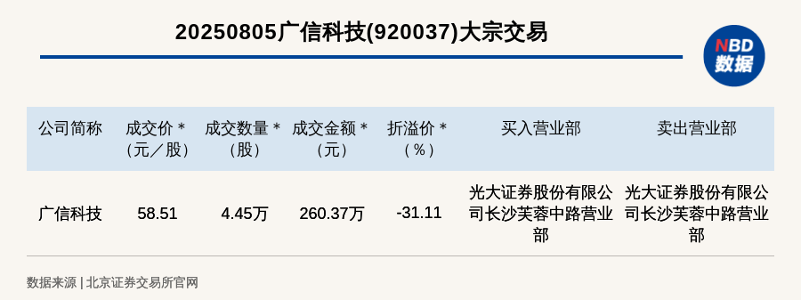 (记者 胡玲) 免责声明:本文内容与数据仅供参考,不构成投资建议,使用前核实。据此操作,风险自担。 每日经济新闻 每经讯,2025年8月5日,北交所上市公司广信科技(920037,收盘价:84.93元)发生一笔大宗交易,成交价58.51元/股,成交 数量4.45万股,成交金额260.37万元,折价31.11%。买入营业部是光大证券股份有限公司长沙芙蓉中路营业部,卖出营业部是光 大证券股份有限公司长沙芙蓉中路营业部。 ...