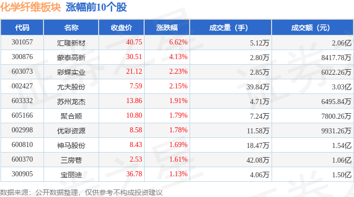 | 代码 | 名称 | 收盘价 | 涨跌幅 | 成交量(手) | 成交额(元) | | --- | --- | --- | --- | --- | --- | | 002064 | 华峰化学 | 12.88 | -5.85% | 77.45万 | 26666 | | 002427 | 尤夫股份 | 7.29 | -4.08% | 30.53万 | 2.25 Z | | 000949 | 新乡化纤 | 7.27 | -3.84% | 98.53万 | 7.16亿 | | 002254 | 泰和新材 | 13.06 | -2.25% | 25.24万 | 3.25亿 | | 000420 | 吉林化纤 | 4.82 | -1.83% | 146.85万 | 28869 | | 688295 | 中复神鹰 | 32.84 | -1.14% | 10.53万 | 3.41亿 | | 600063 | 皖维高新 | 7.03 | -1.13% | 83.08万 | 5.77亿 | | 920077 | 吉林碳谷 | 18.06 | -0.99% | 11.54万 | 2.09亿 | | 001369 | 双欣环保 | ...
