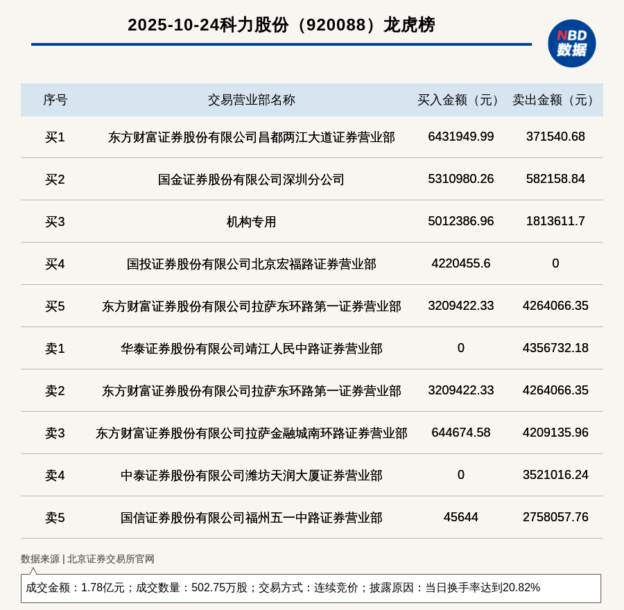 机构席位买入501.24万元 北交所上市公司科力股份登龙虎榜