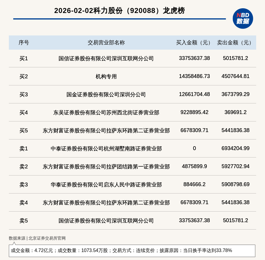 龙虎榜交易概况 - 2026年2月2日,北交所上市公司科力股份因当日换手率达到33.78%登上龙虎榜,交易方式为连续竞价 [1] - 当日成交数量为1073.54万股,成交金额为4.72亿元 [1] 买卖席位与资金流向 - 买入金额最大的席位为国信证券股份有限公司深圳互联网分公司,买入3375.36万元,该席位同时卖出501.58万元 [1][2] - 卖出金额最大的席位为中泰证券股份有限公司杭州湖墅南路证券营业部,卖出693.42万元 [1][2] - 机构专用席位出现在买方,买入1435.85万元,同时卖出450.76万元 [2] - 东方财富证券股份有限公司拉萨东环路第二证券营业部同时出现在买卖双方,买入667.83万元,卖出544.18万元 [2]