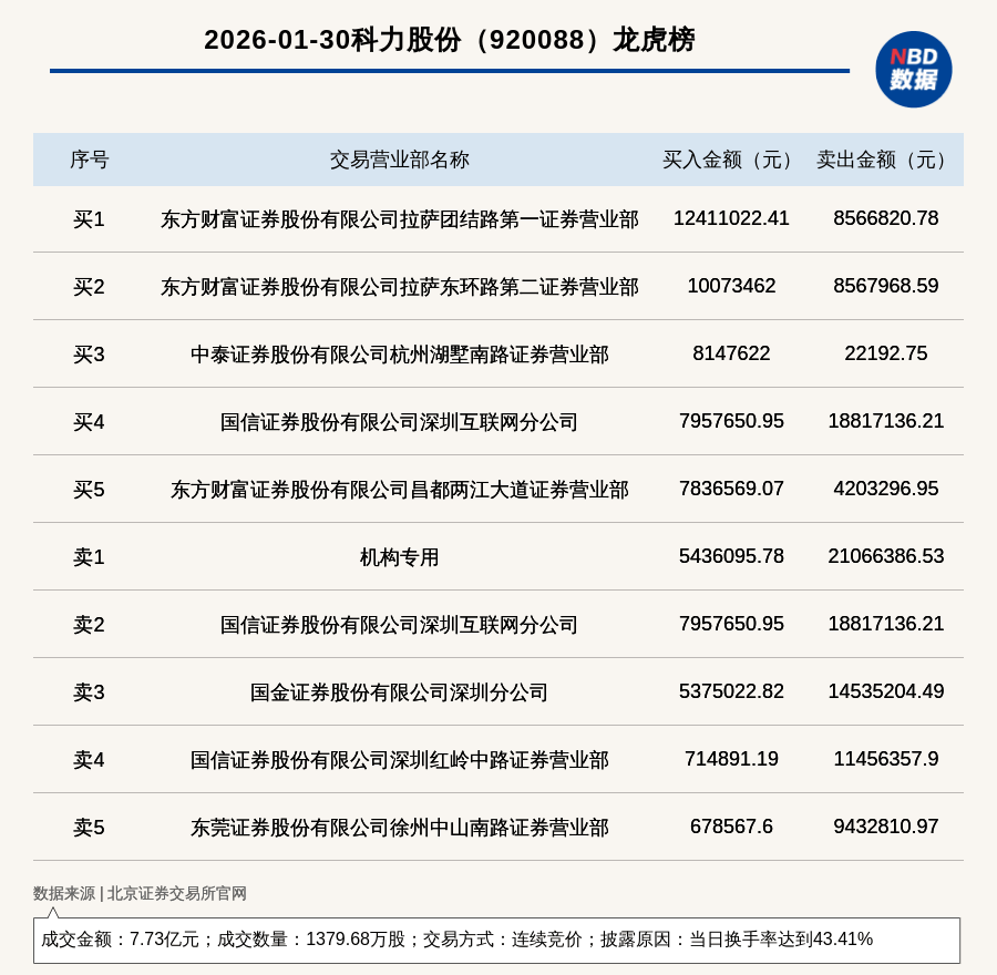 龙虎榜交易概况 - 2026年1月30日,北交所上市公司科力股份因当日换手率达到43.41%登上龙虎榜,交易方式为连续竞价 [1] - 当日成交数量为1379.68万股,成交金额为7.73亿元 [1] 买卖席位与资金流向 - 买入金额排名第一的席位为东方财富证券股份有限公司拉萨团结路第一证券营业部,买入1241.1万元 [1] - 卖出金额排名第一的席位为机构专用,卖出2106.64万元 [1] - 龙虎榜数据显示,买入前五席位合计买入金额约为4663.5万元(根据表格数据计算:12411022.41 + 10073462 + 8147622 + 7957650.95 + 7836569.07)[2] - 卖出前五席位合计卖出金额约为7533.4万元(根据表格数据计算:21066386.53 + 18817136.21 + 14535204.49 + 11456357.9 + 9432810.97)[2] - 国信证券股份有限公司深圳互联网分公司同时出现在买4和卖2席位,买入795.77万元,卖出1881.71万元,净卖出 [2]