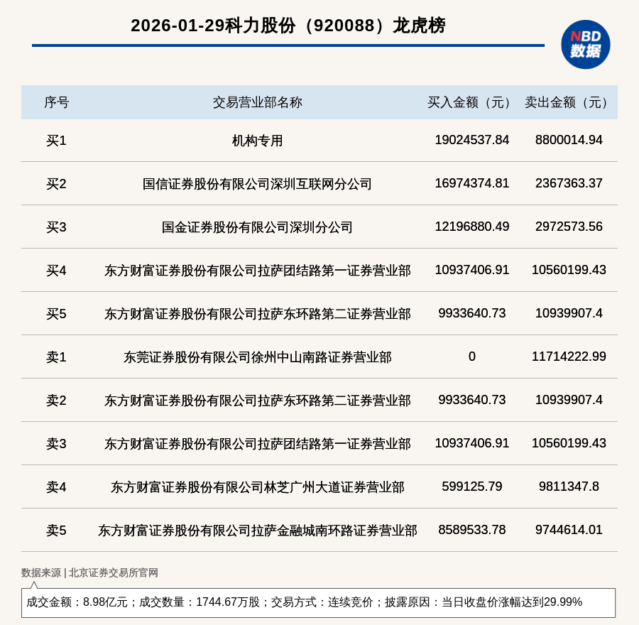公司股价异动 - 2026年1月29日,北交所上市公司科力股份收盘价涨幅达到29.99% [1] - 当日成交数量为1744.67万股,成交金额为8.98亿元 [1] - 公司股票登上龙虎榜,交易方式为连续竞价 [1] 龙虎榜交易席位 - 买入金额最大的席位为机构专用席位,买入1902.45万元 [1] - 卖出金额最大的席位为东莞证券股份有限公司徐州中山南路证券营业部,卖出1171.42万元 [1]
