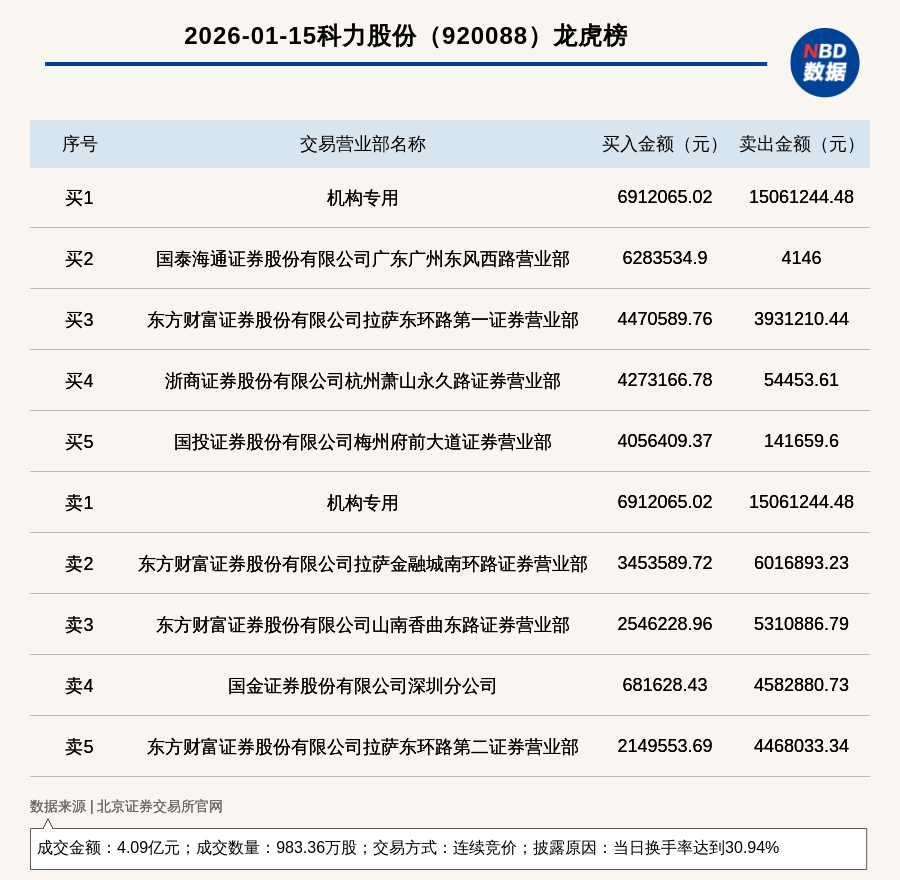 龙虎榜交易概况 - 科力股份于2026年1月15日因当日换手率达到30.94%登上北交所龙虎榜 交易方式为连续竞价 [1] - 当日成交数量为983.36万股 成交金额为4.09亿元 [1] 买卖席位与资金流向 - 买入金额第一的席位为机构专用 买入691.21万元 [1][2] - 卖出金额第一的席位同为机构专用 卖出1506.12万元 该席位同时买入691.21万元 [1][2] - 买入金额第二的席位为国泰海通证券股份有限公司广东广州东风西路营业部 买入628.35万元 [2] - 卖出金额第二的席位为东方财富证券股份有限公司拉萨金融城南环路证券营业部 卖出601.69万元 [2] - 龙虎榜数据显示 多个东方财富证券位于拉萨及山南的营业部同时出现在买卖前五席位中 [2]