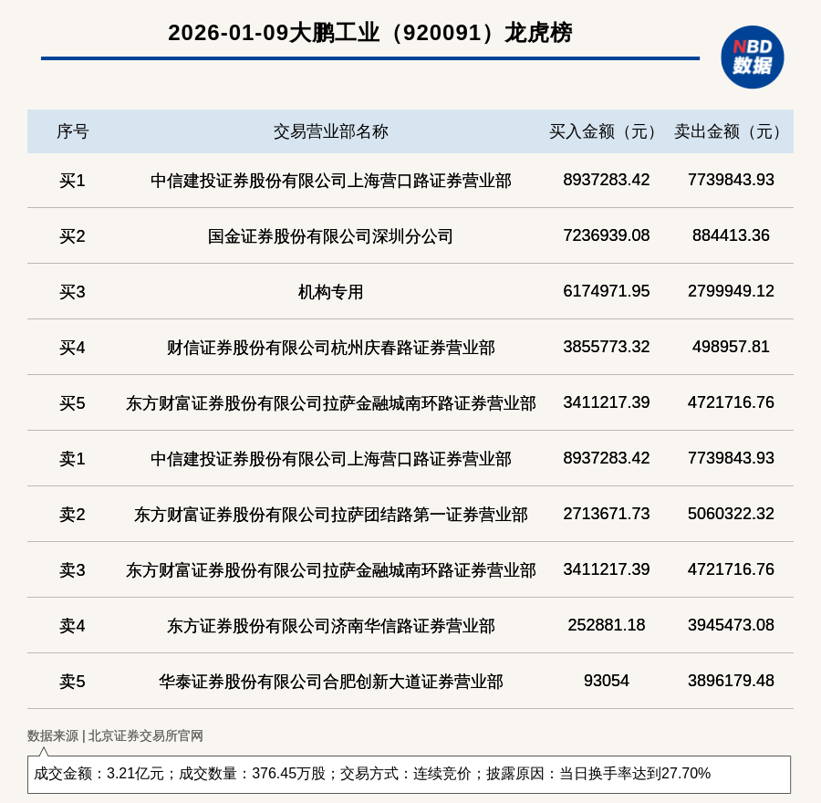 龙虎榜交易概况 - 2026年1月9日,北交所上市公司大鹏工业因当日换手率达到27.70%登上龙虎榜,交易方式为连续竞价 [1] - 当日成交数量为376.45万股,成交金额为3.21亿元 [1] 买卖席位与资金流向 - 买入金额第一的席位为中信建投证券股份有限公司上海营口路证券营业部,买入893.73万元,该席位同时为卖出金额第一的席位,卖出773.98万元 [1][2] - 买入金额第二的席位为国金证券股份有限公司深圳分公司,买入723.69万元 [2] - 买入金额第三的席位为机构专用,买入617.50万元,同时卖出279.99万元 [2] - 卖出金额第二的席位为东方财富证券股份有限公司拉萨团结路第一证券营业部,卖出506.03万元 [2] - 卖出金额第三的席位为东方财富证券股份有限公司拉萨金融城南环路证券营业部,卖出472.17万元,同时买入341.12万元 [2]