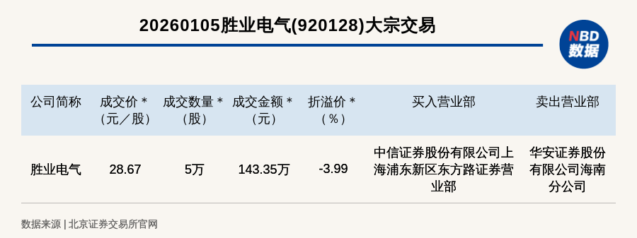 每经讯,2026年1月5日,北交所上市公司胜业电气(920128,收盘价:29.86元)发生一笔大宗交易,成交价28.67元/股,成交 数量5万股,成交金额143.35万元,折价3.99%。买入营业部是中信证券股份有限公司上海浦东新区东方路证券营业部,卖出营 业部是华安证券股份有限公司海南分公司。 免责声明:本文内容与数据仅供参考,不构成投资建议,使用前核实。据此操作,风险自担。 每日经济新闻 (记者 曾健辉) ...