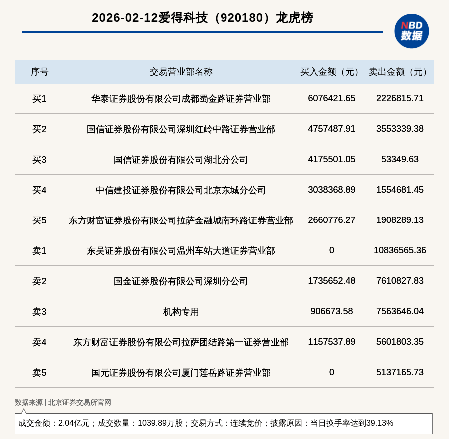 公司交易异动 - 2026年2月12日,北交所上市公司爱得科技因当日换手率达到39.13%登上龙虎榜,交易方式为连续竞价 [1] - 当日成交数量为1039.89万股,成交金额为2.04亿元 [1] 龙虎榜买卖席位详情 - 买入金额排名第一的席位为华泰证券股份有限公司成都蜀金路证券营业部,买入607.64万元 [1][2] - 卖出金额排名第一的席位为东吴证券股份有限公司温州车站大道证券营业部,卖出1083.66万元 [1][2] - 机构专用席位出现在卖方,卖出756.36万元,同时买入90.67万元 [2]