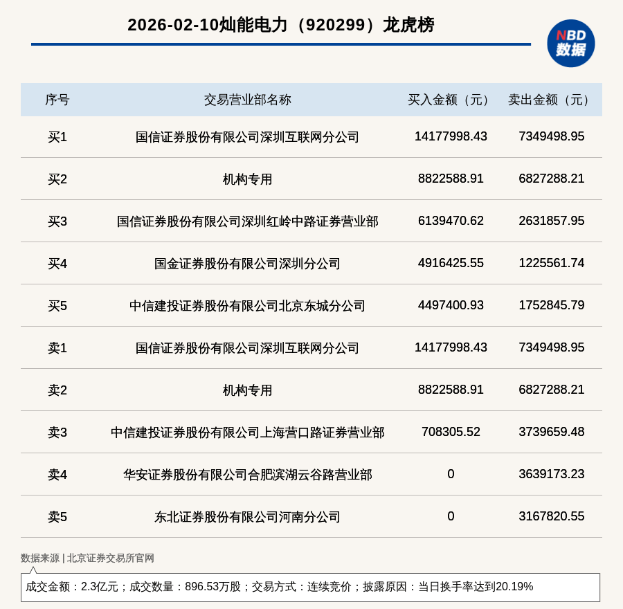 龙虎榜交易概况 - 2026年2月10日,北交所上市公司灿能电力因当日换手率达到20.19%登上龙虎榜,成交数量为896.53万股,成交金额为2.3亿元[1] - 交易方式为连续竞价[1] 买卖席位与金额 - 买入金额排名第一的席位为国信证券股份有限公司深圳互联网分公司,买入金额为1417.8万元[1][2] - 同一席位(国信证券深圳互联网分公司)同时也是卖出金额排名第一的席位,卖出金额为734.95万元[1][2] - 买入金额排名第二的席位为机构专用,买入金额为882.26万元,同时该席位卖出金额为682.73万元,位列卖出席位第二[2] - 买入金额排名第三的席位为国信证券股份有限公司深圳红岭中路证券营业部,买入金额为613.95万元,卖出金额为263.19万元[2] - 卖出席位第三为中信建投证券股份有限公司上海营口路证券营业部,卖出金额为373.97万元,买入金额为70.83万元[2] - 卖出席位第四为华安证券股份有限公司合肥滨湖云谷路营业部,卖出金额为363.92万元,买入金额为0元[2] - 卖出席位第五为东北证券股份有限公司河南分公司,卖出金额为316.78万元,买入金额为0元[2]
