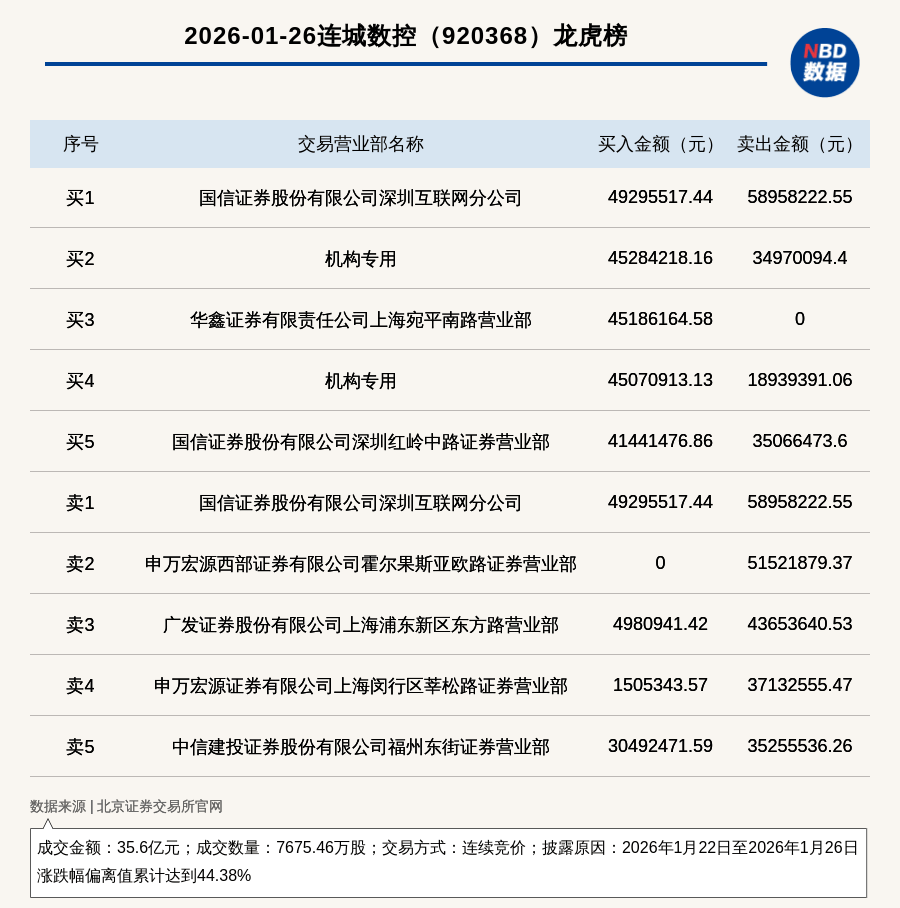 公司股价异动与龙虎榜数据 - 北交所上市公司连城数控(920368)于2026年1月26日因股价异常波动登上龙虎榜 [1] - 披露原因为2026年1月22日至2026年1月26日期间,其股价涨跌幅偏离值累计达到44.38% [1] - 该期间成交数量为7675.46万股,成交总金额高达35.6亿元 [1] 龙虎榜买卖席位详情 - 买入金额最大的席位为国信证券股份有限公司深圳互联网分公司,买入4929.55万元,该席位同时也是卖出金额最大的席位,卖出5895.82万元 [1][2] - 龙虎榜买入前五席位合计买入金额巨大,其中包含两个“机构专用”席位,分别买入4528.42万元和4507.09万元 [2] - 卖出前五席位中,申万宏源西部证券有限公司霍尔果斯亚欧路证券营业部卖出5152.19万元,广发证券股份有限公司上海浦东新区东方路营业部卖出4365.36万元 [2]