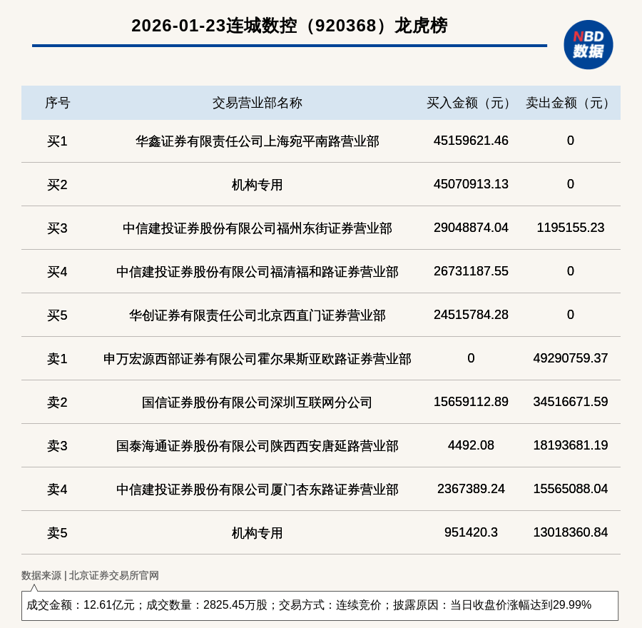 公司股价异动 - 2026年1月23日,北交所上市公司连城数控(920368)收盘价涨幅达到29.99% [1] - 当日成交数量为2825.45万股,成交金额为12.61亿元 [1] - 交易方式为连续竞价 [1] 龙虎榜买卖席位详情 - 买入金额最大的席位为华鑫证券上海宛平南路营业部,买入4515.96万元 [1][2] - 卖出金额最大的席位为申万宏源西部证券霍尔果斯亚欧路营业部,卖出4929.08万元 [1][2] - 买入前五席位合计买入金额约为1.705亿元,其中机构专用席位买入4507.09万元 [2] - 卖出前五席位合计卖出金额约为1.305亿元,其中机构专用席位卖出1301.84万元 [2] - 部分营业部同时出现在买卖双方,例如国信证券深圳互联网分公司买入1565.91万元并卖出3451.67万元 [2]