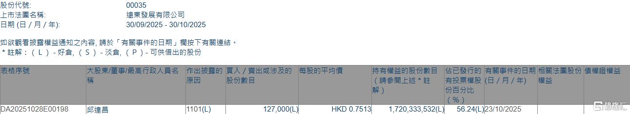 远东发展(00035.HK)获执行董事邱达昌增持24.9万股